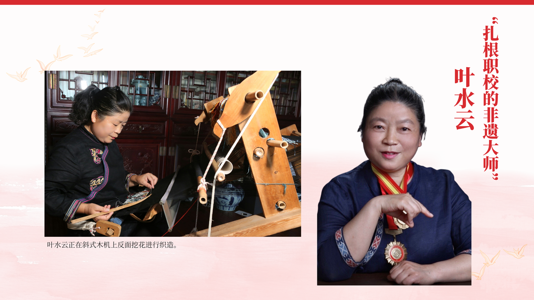 中国工艺美术大师、国家级非物质文化遗产土家织锦技艺代表性传承人、湘西民族职业技术学院专业骨干教师叶水云,踏遍土家山寨,收罗千份遗珍,带领青年教师制作55个微课、63个文本、99个视频等课程资源,编撰完成《土家织锦技艺》教材,实现非遗“云端”活态传承;她躬耕讲坛40载,把学校当成家,通过非遗专业教学、社会培训等多种方式,累计培养学生、徒弟3000余人;其研发的100多种融合非遗元素的旅游商品在全国各地“走俏”,甚至远销海外。细细的丝线,正通过“叶水云们”的巧手跨越千年,让世界看见中国之美。